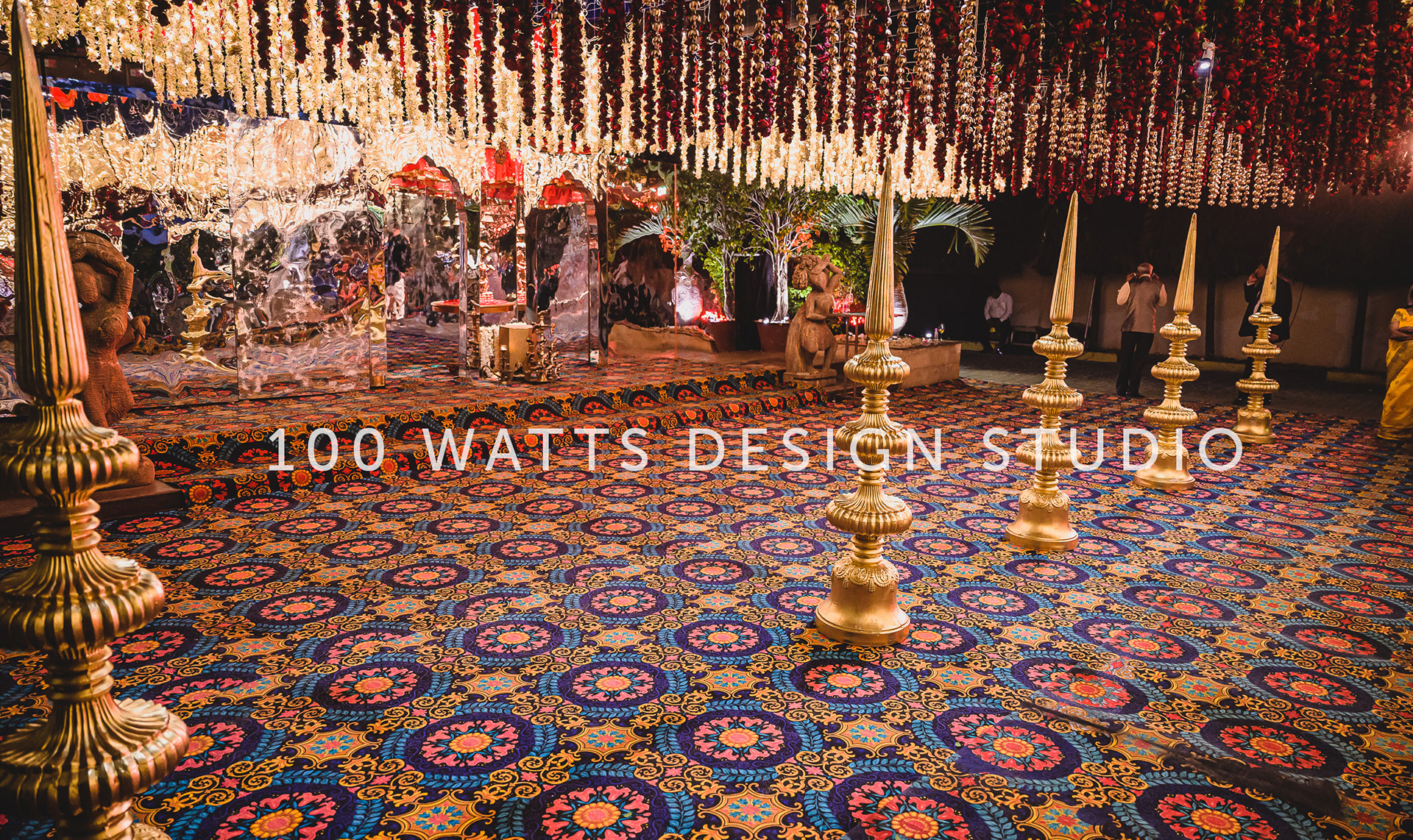 A gold lotus mandap in the centre of a pond. All around, seating insipired by the ancient stepwells. Hundreds of temple bells glowing overhead. Candles flickering infinitely into the distance. Reflections everywhere. The fragrance of temple flowers. Strains of a live flute in the distance. Classical Indian ragas permeate the air. An experience that completely immerses you. A marriage set in the temple of the heavens.